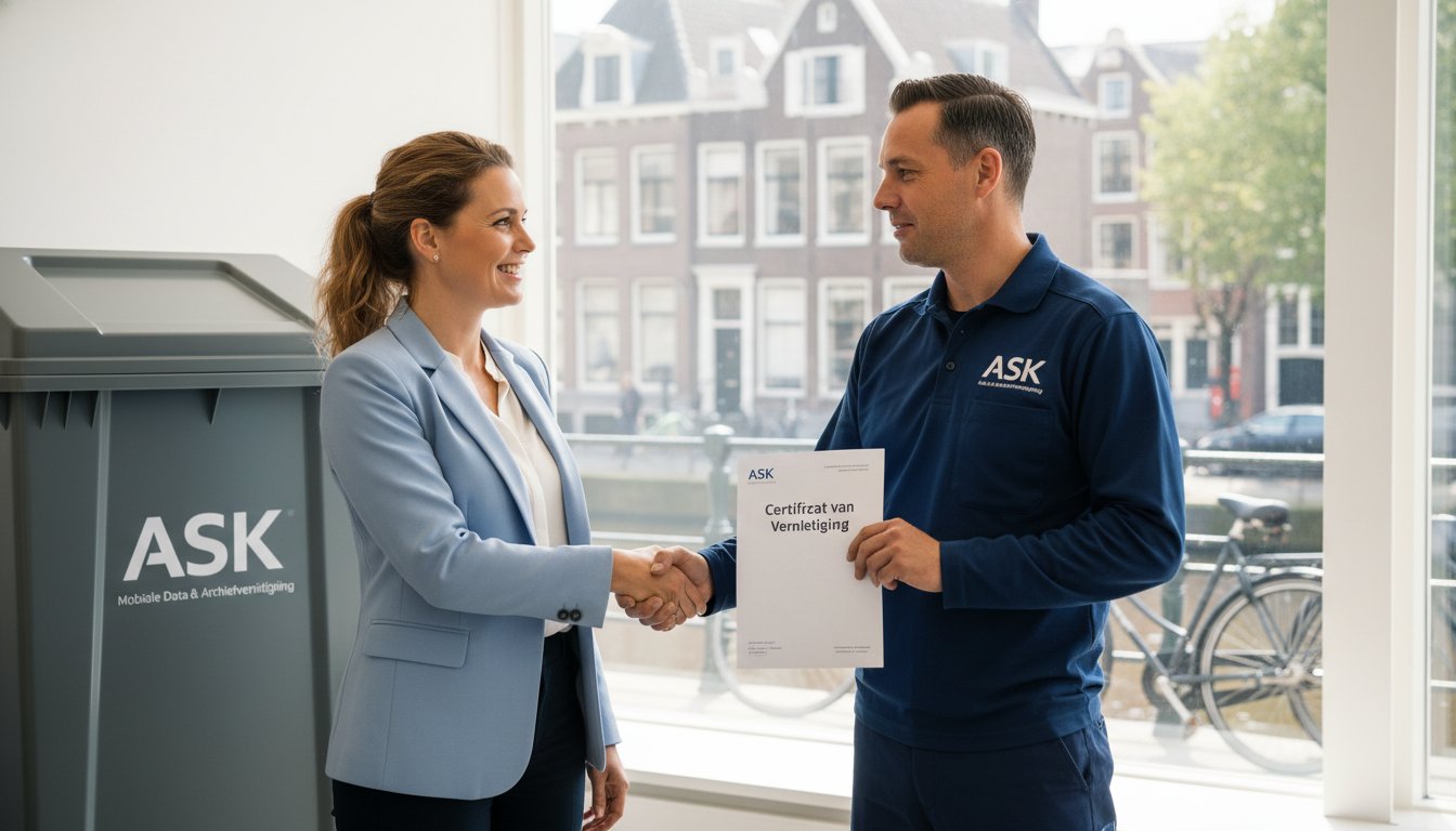 Een officieel certificaat vermeldt de naam van uw bedrijf, de datum en locatie van vernietiging, een omschrijving van het vernietigde materiaal (bv. ‘vertrouwelijk archief’), de norm waaronder is vernietigd (bv. DIN 66399), en de handtekening van de uitvoerende partij. Dit maakt het een sluitend bewijsstuk voor de Autoriteit Persoonsgegevens.
